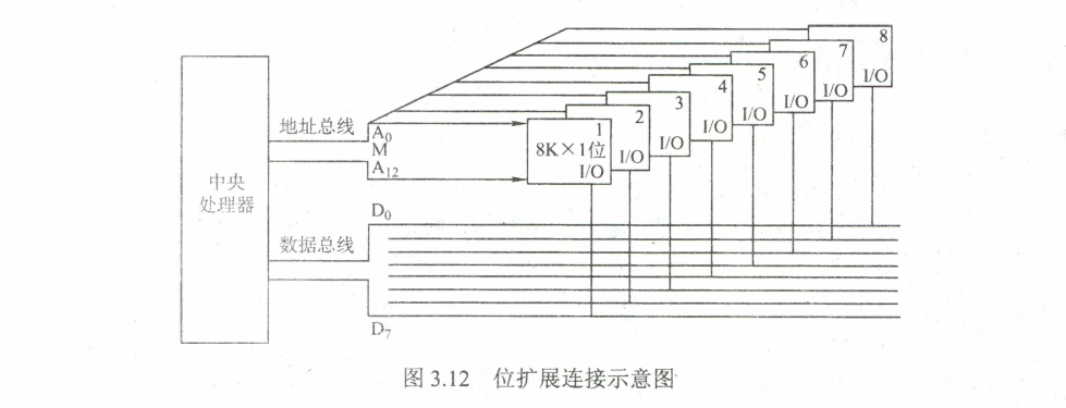 CPU的数据线数与存储芯片的数据位数不一定相等, 此时必须对存储芯片扩位。位扩展是将多个存储芯片的地址端、片选端和读写控制端相应并联,数据端分别引出。