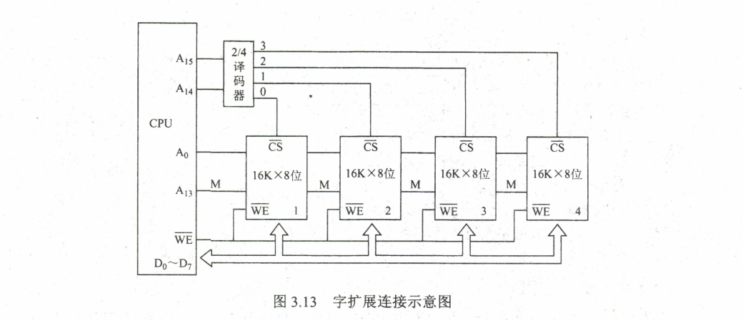 仅采用字扩展时,各芯片连接地址线的方式相同,连接数据线的方式也相同,但在某时刻只需选中部分芯片,所以通过片选信号 $ \overline{CS} $ 或采用译码器设计连接到相应的芯片。